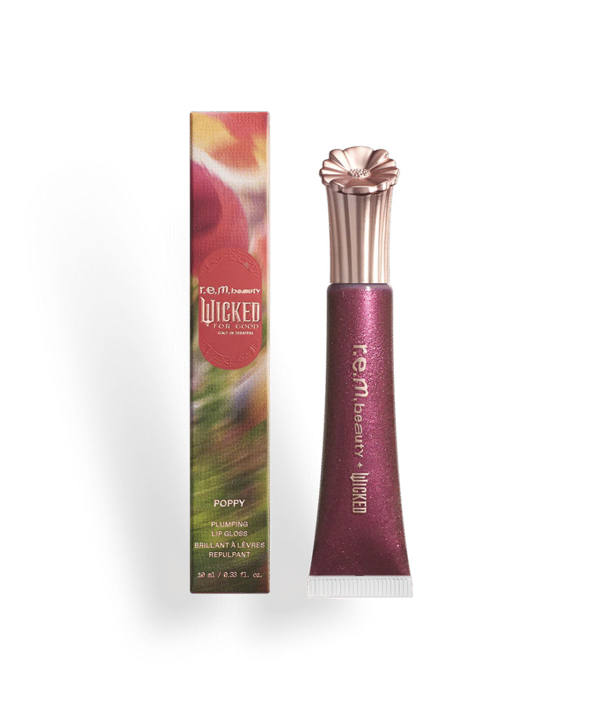 r.e.m beauty dévoile sa collection Wicked : For Good à l’occasion du lancement de Wicked Part 2. Le Poppy Plumping Lip Gloss s’inspire des champs de coquelicots d’Oz. Il se décline en couleurs vibrantes : rouge éclatant, prune intense, et un fini irisé violet et doré qui apporte des reflets lumineux sur les lèvres. Sa formule ultra-brillante et non-collante repulpe instantanément et hydrate les lèvres, pour un éclat lumineux.